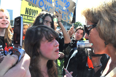 On the other side were hundreds of right-wing, pro-war people. They had been organized by a group called Move America Forward, whose chairman, Melanie Morgan, is a fascist host on a local radio show. Besides a large number of U.S. and Marine flags, this group also had signs that called Code Pink terrorists and demanded “waterboard the liberals.” Patriotic music blasted while speakers demanded that the Berkeley City Council apologize, that they and all the anti-Iraq War demonstrators be jailed for treason and the key thrown away.