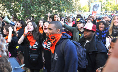 The youth were on the front lines of the protest all day and subjected to violent police repression. A 13-year-old in the seventh grade was thrown on the ground and handcuffed by police and dragged off to the police station after he argued with a reactionary who got in his face. A 15-year-old was also arrested at the same time for no good reason. A large group of youth followed them to the police station and did a sit-in on the steps until they were pushed off the steps by baton-swinging cops in riot gear. The sister of the arrested 15-year-old was slammed up against the wall of the police station and arrested when she went to find out about him. The students stayed around the police station, yelling at the police and demanding that the arrested youth be freed.