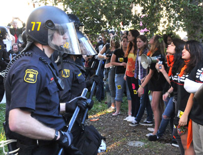 A Berkeley High junior described one police attack: “Out of nowhere, for no reason at all, we weren’t moving forward, the riot police officers just started saying 'Move back! Move back!' and there was nowhere for me to move. The first time I was on my friend’s shoulder and they started night-sticking me in the knees. The second time they just pushed the stick right into my chest and I fell backwards. Another time—to the American anthem, might I add, they pushed one of my friends out of the way and I looked up to see what happened, and the guy pulled me across the shoulders, pulled me back, night-sticked me in the stomach and then grabbed my throat and threw me on the ground and told me to move back more.”