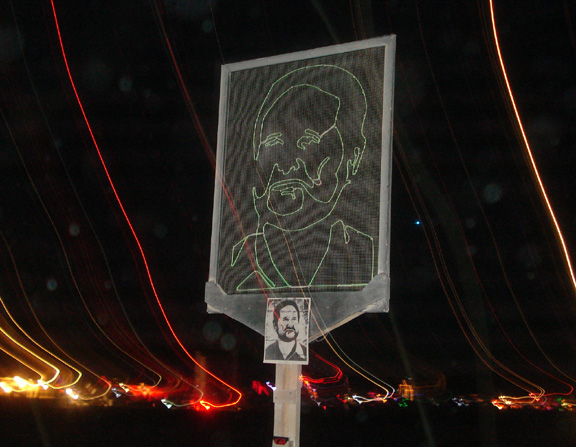 We installed a large flashing neon version of Bob Avakian's image in the midst of the art on the playa. Although only visible at night, it looked great! Hundreds of image cards were distributed at the festival itself—left at camps, many of the numerous free bars and parties, and stuck in the spokes of participants' bicycles.