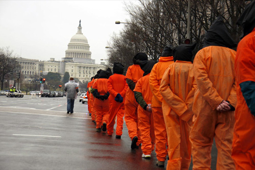 “About 800 of us marched from the White House, past the Department of Justice, and stood in front of the Supreme Court, opposite the Capitol. Amnesty International brought a lot of students,” reports Debra Sweet, director of The World Can’t Wait. 171 participants dressed in orange jumpsuits with black hoods to represent the 171 current Guantánamo detainees. |