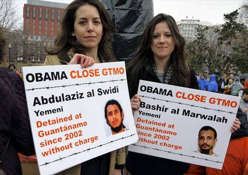 | Above: Two lawyers who represent detainees at Guantánamo were among many such attorneys who protested with signs that told about the prisoners. It was reported that many prisoners at Guantánamo were heartened when they learned about plans to protest the 10th year of the prison and some were reported to be planning protests inside Guantánamo itself. Photo: Andrew Courtney |