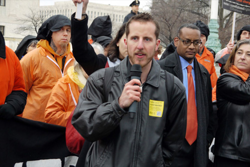 | Daniel J. Lakemacher, a former Guantánamo prison guard and now a conscientious objector, speaking at one of the rallies along the march route. Photo: Andrew Courtney |