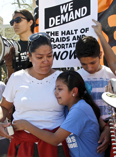 March 2013, Phoenix. Family at a demonstration against deportation; the husband/father is in custody after being arrested in a workplace raid and he faces deportation.