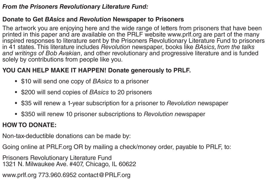 Las obras de arte que usted disfruta en esta página y la amplia gama de cartas de las y los presos que se han publicado en las páginas de este periódico y que se pueden descargar en la página web del Fondo (prlf.org) constituyen una parte de las muchas respuestas inspiradas en la literatura que ha enviado el Fondo a las y los presos en 41 estados. Entre esta literatura figuran: el periódico Revolución, libros como Lo BAsico, de los discursos y escritos de Bob Avakian y otra literatura progresista y revolucionaria y que se cubre exclusivamente mediante las donaciones de personas como usted.
