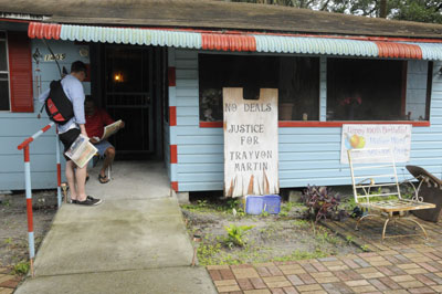 Earlier, driving through the neighborhood we had noticed that some people had put different signs up in their windows about Trayvon. Now, as we start walking down the road a ways we see a house with a big sign in front that says, "No Deals—Justice for Trayvon." So we walk up to the door. An older man is sitting behind the screen door and I tell him that we were wanting to talk to someone about the sign outside and he says, "We put that sign up there because of the hypocrisy going on and enough is enough." Then another man, Donald, who is the son of the older gentleman, comes out to talk. He tells us that he was out at the protests last year to demand Zimmermans's arrest.