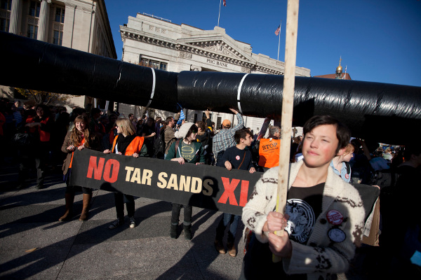 November 2011, demonstrators march outside the White House, Washington, DC, with a replica of a pipeline demanding a stop to the Keystone XL tar sands oil pipeline.