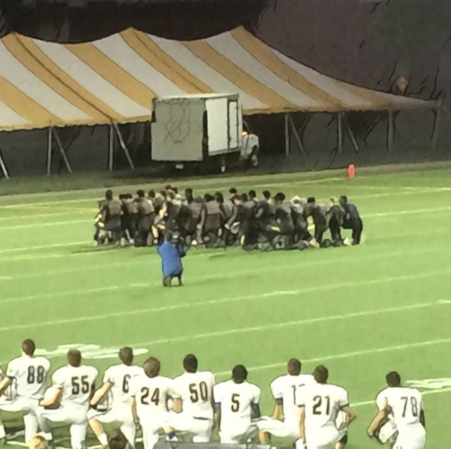 Two players, one white, one African-American, took a knee as a silent protest, Lincoln Southeast High School, Lincoln, NE.