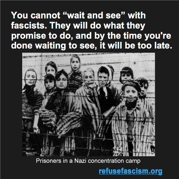 After the election, Obama said of Trump: “We are now all rooting for his success.” NO! If Trump succeeds, humanity loses. Bernie Sanders has said that he will work with Trump on jobs or where they agree. NO! If you work with fascists you normalize the road to horror.