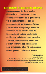 Este sistema y aquellos que gobiernan no son capaces de llevar a cabo desarrollo económico que cumpla con las necesidades de la gente ahora y a la vez balancear eso con las necesidades de generaciones futuras y los requisitos de proteger el medio ambiente. No les importa nada de la exquisita diversidad en el medio ambiente y en la tierra y sus especies y los tesoros que tiene a menos que puedan convertir eso en ganancias para sí mismos... Ellos no son capaces de ser quienes cuidan este planeta. Bob Avakian,