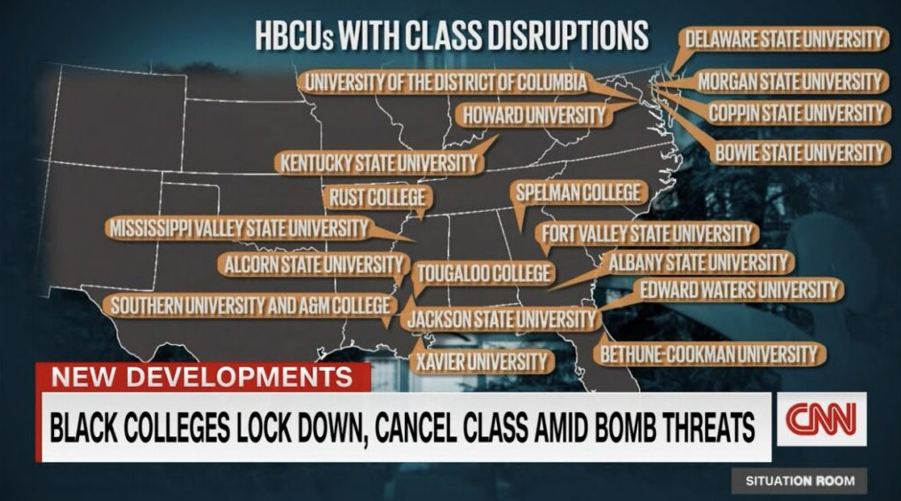 The schools reporting receiving threats were Alabama State University, Hampton University (Virginia), Virginia State University, Southern University and A&M College (Louisiana), Bethune-Cookman University (Florida), and Clark Atlanta University. A number of HBCUs that did not directly receive threats, including Spelman College in Atlanta, also locked down or increased security measures out of caution.
