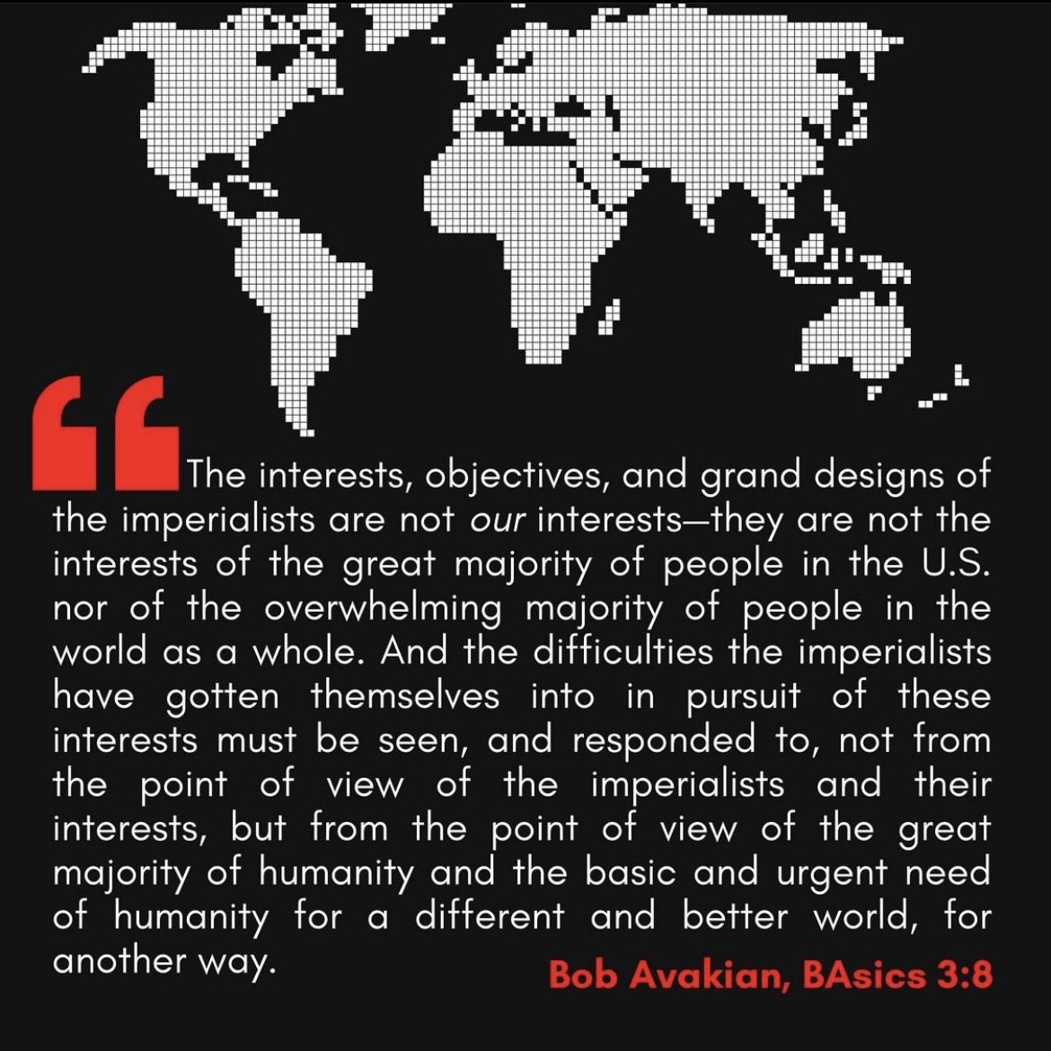 It’s true that changing people’s ideas is enormously important. In fact, transforming people’s thinking is a fundamental part of the revolutionary process, both before and after overthrowing this system and forging another radically different system. But first, changing people’s ideas to what other ideas and to achieve what? It must be nothing less than upholding the emancipation of all humanity, and not simply the interests of one group or country against others. It must be to serve the people and be caretakers of the environment, rather than merely seeking “something for me and my people.”