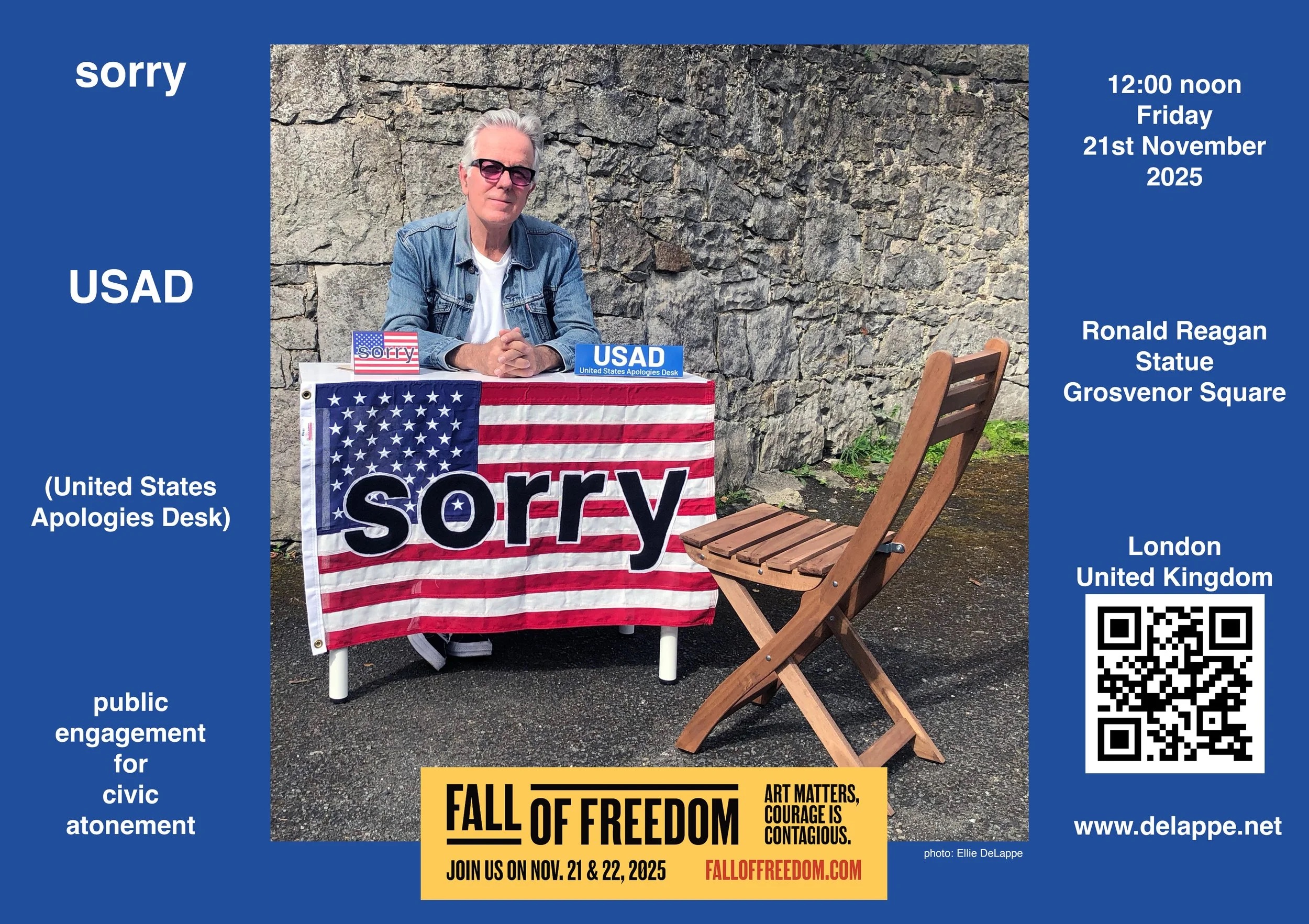 Joseph DeLappe participates from London: Beginning at 12:00 noon, DeLappe at at a small desk adorned with a cotton American flag, altered by hand-sewn woollen letters to read ‘SORRY’. A placard on the desk read ‘USAD – United States Apologies Desk’, playfully framing the action as an unofficial diplomatic mission. An empty chair opposite DeLappe invited passers-by to sit, talk, and reflect. Each participant received a hand-signed apology card, including a personal pledge from DeLappe that he will continue to resist Donald Trump and all forms of fascist ideology through civic and creative engagement.