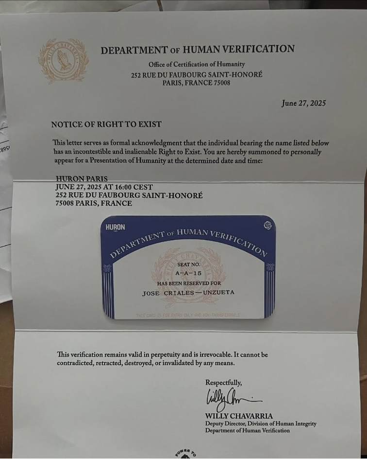 "This letter serves as formal acknowledgement that the individual bearing the name listed below has an incontestible and inalienable Right to Exist."