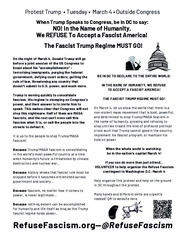 On March 4, let us show the world that there is a non-violent mass movement that is bold, powerful, and determined to stop Trump/MAGA fascism in the name of humanity, growing and refusing to stop until we create the kind of profound political crisis such that Trump cannot govern the country, implement his fascist program, or maintain his hold on power.