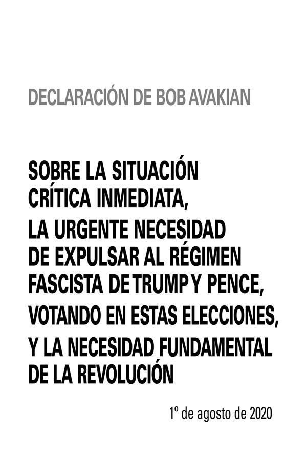 tienen que unirse a aquellos que ya están en las calles, que no están esperando a que se celebren algunas elecciones que Trump ya está robándose mediante un golpe de estado fascista en marcha, y en su lugar están asumiendo al llamamiento de RefuseFascism.org (Rechazar el Fascismo) a una movilización no violenta sostenida, día tras día, propagando la demanda de que ¡el régimen de Trump y Pence tiene que marcharse YA!4o de 2020, Sobre la situación crítica inmediata, la urgente necesidad de expulsar al régimen fascista de Trump y Pence, votando en estas elecciones, y la necesidad fundamental de la revolución. Esta Declaración está disponible en revcom.us. [volver]