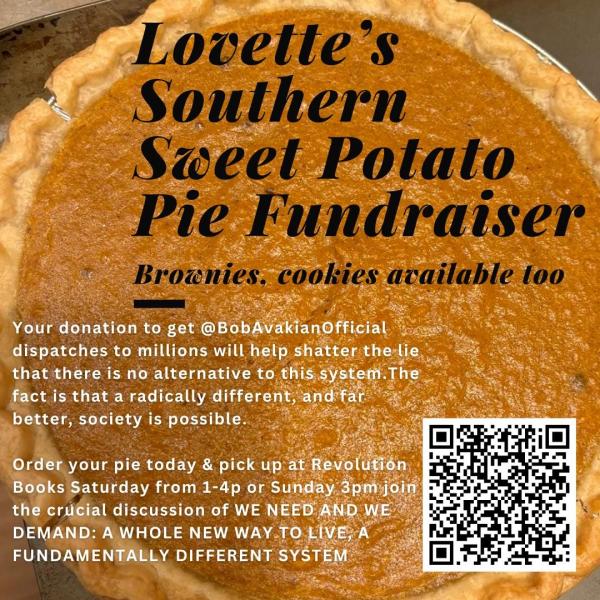 EL CUERPO REVCOM Por Emancipación De La Humanidad organizó una exitosa venta de productos horneados para recaudar fondos en la ciudad de Nueva York. Recaudamos más de $1.194 para promover y difundir @BobAvakianOfficial en las redes sociales en todas partes. La iniciativa incluyó “pasteles de batata al estilo del Sur de Lovette” y otros productos horneados donados por personas que han estado trabajando con la Revolución durante mucho tiempo y otras que apenas están comenzando a conocer la dirección de Bob Avakian mediante estos mensajes en las redes sociales.