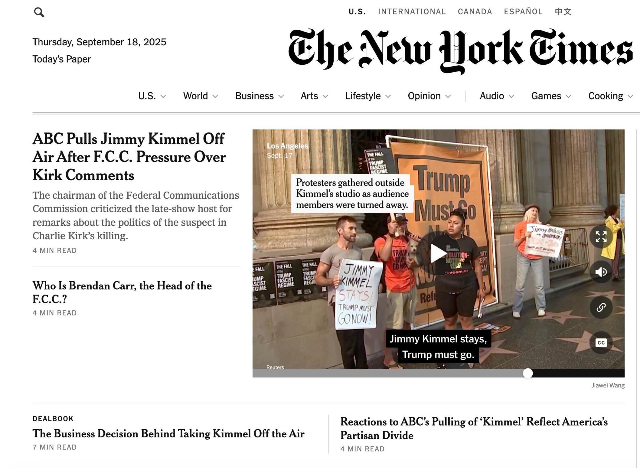 Esa misma noche, Jimmy Kimmel se atrevió a expresar una observación sobre la manera en que MAGA se estaba aprovechando de la muerte de Kirk. Luego, Kimmel se burló de la hipocresía de Trump al fingir que se preocupaba por Kirk. Menos de 48 horas después, Kimmel fue suspendido; en realidad, fue despedido. Otros han sido despedidos por los “medios corporativos” por atreverse a expresar sus reservas sobre la santificación total a favor de Kirk, un agitador fascista, racista, misógino y anti-gay.