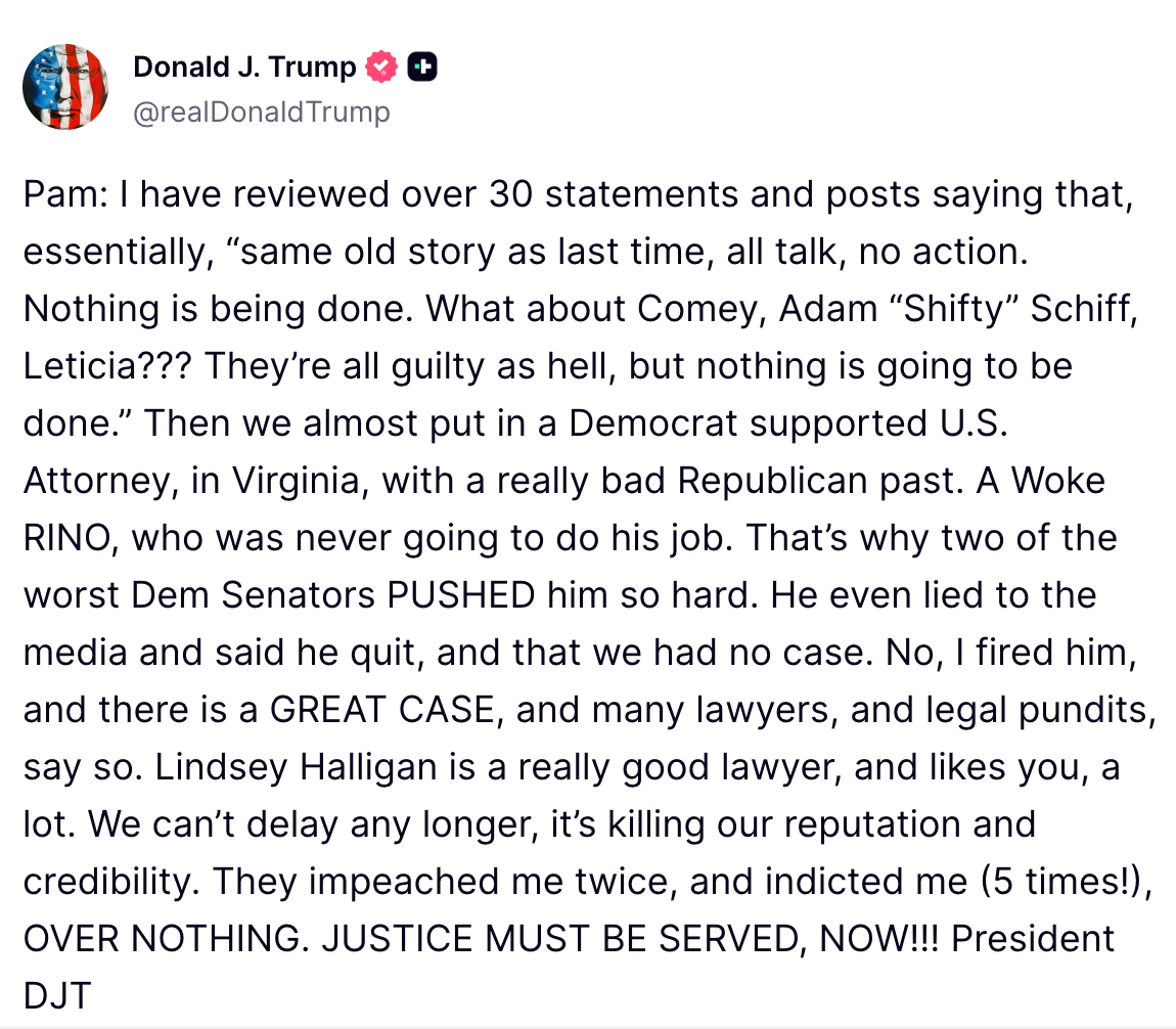 Pam: He revisado más de 30 declaraciones y posteos que dicen que, en esencia, “es la misma historia que la vez anterior: pura palabrería y nada de acción. No se está haciendo nada. ¿¿¿Y qué hay de Comey, Adam ‘Shifty’ Schiff y Leticia??? Son más culpables que un carajo, pero no se va a hacer nada”. Y, casi nombramos en Virginia a un fiscal federal apoyado por los demócratas, con un pésimo pasado republicano. Un RINO [republicano sólo de nombre] woke que nunca iba a cumplir con su trabajo. Por eso dos de los peores senadores demócratas lo PROMOVIERON tanto. Incluso mintió a los medios y dijo que renunciaba, y que no teníamos argumentos en su contra. No, lo despedí, y hay BUENOS ARGUMENTOS EN SU CONTRA, y muchos abogados y expertos jurídicos lo dicen. Lindsey Halligan es una abogada excelente y te aprecia mucho. No podemos demorarnos más, está arruinando nuestra reputación y credibilidad. Me condenaron en dos juicios políticos y me imputaron (¡en cinco ocasiones!), POR NADA. ¡¡¡HAY QUE HACER JUSTICIA YA!!! Presidente DJT.