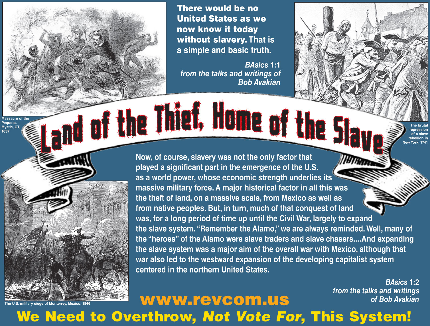 1) This system of capitalism-imperialism is the source of endless horrors for the majority of people in this country and all around the world, and it is increasingly threatening the very existence of humanity. We are actively working for an actual revolution—to bring down, to overthrow and completely abolish, this whole system as soon as possible and replace it with something radically different and much better, a new society built on an entirely different foundation... READ ON
