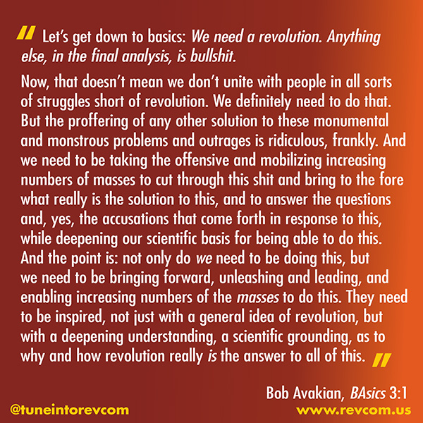 This road is hard, but it is real. If you really care—and if you’ve read this far, you do—then to turn away from finding out about that road and deeply engaging the person who brought it forward would be unconscionable. If you do nothing else during this holiday period, see the new filmed speech by Bob Avakian, Why We Need An Actual Revolution And How We Can Really Make Revolution.