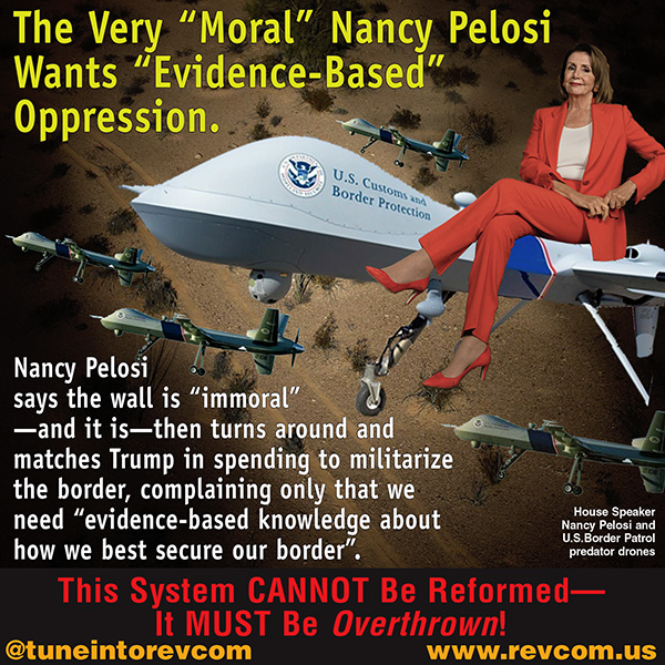 First off, we should be clear: these negotiations are struggle within the ruling class—over how vicious the repression of immigrants should be, how best to carry out this repression, and where this will “fit into” the new social and political “norms” now being fought out. Nancy Pelosi, the House speaker and highest-ranking Democrat, has already been giving ground. She has increasingly upped the Democrats’ spending proposals for “border security” (translation: militarization of the border) to match Trump’s. Instead of making a big deal out of how “immoral” the wall would be, she has shifted to focusing her objections on demanding more “evidence-based” measures to carry out this repression.1