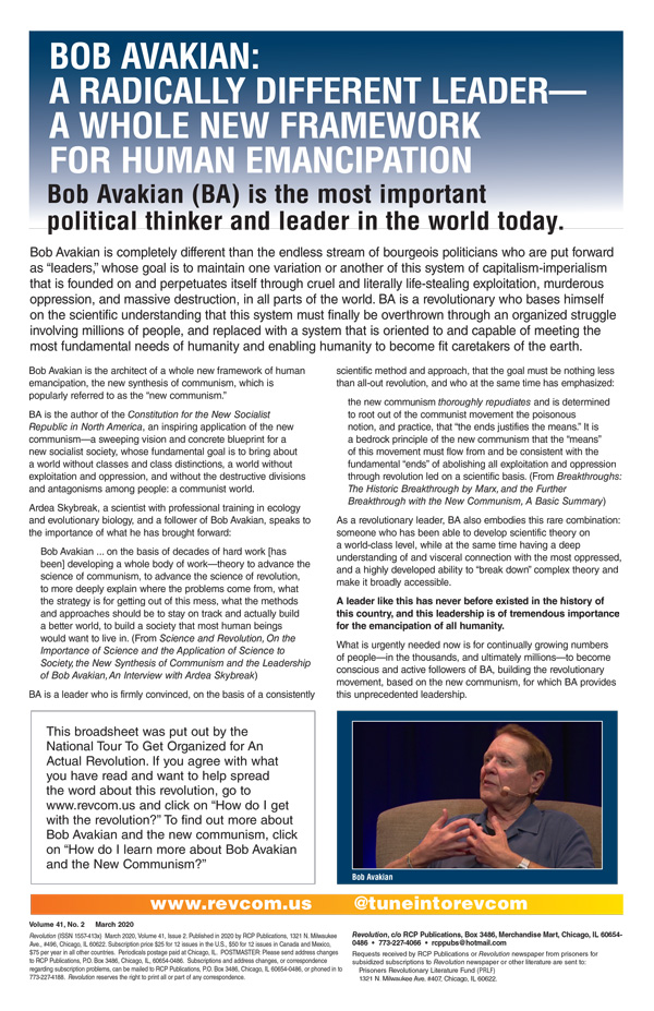 He has developed the science, the strategy, and the concrete vision and blueprint for a radically different and much better society and world in the Constitution for the New Socialist Republic in North America. At the same time, BA deeply understands and connects with the most oppressed, and he provides strategic leadership for the movement today.