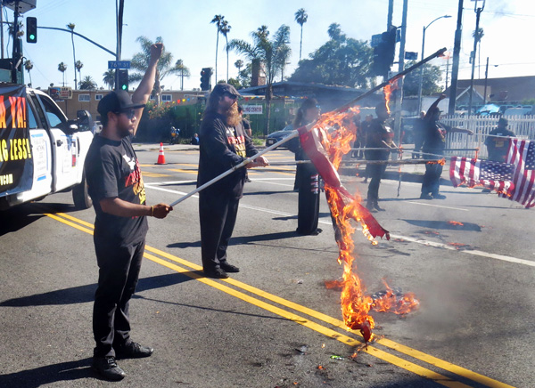 Five American flags, one for each of the Five Stops, go up in flames June 8, 2019, in front of the 77th Division of the LAPD. The National Get Organized for an ACTUAL Revolution Tour in South Central, Los Angeles.