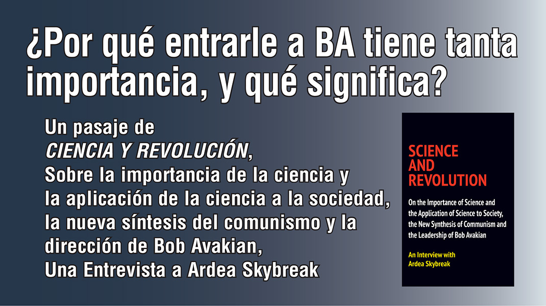 Más bien, nuestro trabajo colectivo tiene un propósito específico: profundizar nuestro conocimiento del mundo, pero no para conocerlo en un sentido académico solamente, sino para CAMBIARLO radicalmente. Y, más específicamente, profundizar nuestro entendimiento y aplicación de la ciencia de la revolución y el comunismo, tal como se ha hecho avanzar cualitativamente esta ciencia de maneras pioneras mediante el nuevo comunismo desarrollado por BA — profundizar nuestro entendimiento y aplicación de esta ciencia como una parte central de contribuir al proceso de hacer la revolución sobre la base de este nuevo comunismo.