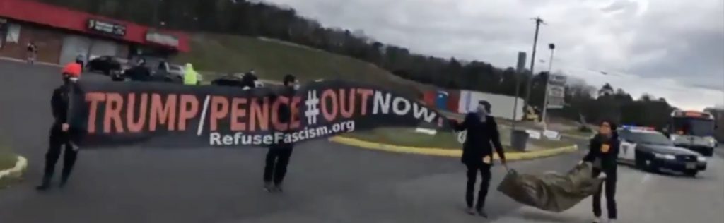 Refuse Fascism with symbolic “body bags” across from the Trump National Golf Club in Pine Hill, New Jersey.