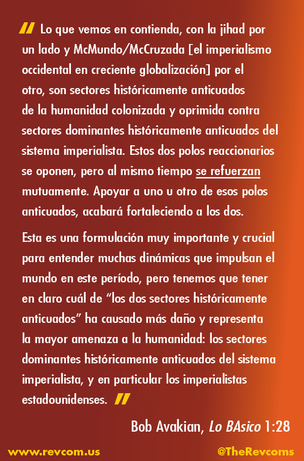 Lo que vemos en contienda, con la jihad por un lado y McMundo/McCruzada [el imperialismo occidental en creciente globalización] por el otro, son sectores históricamente anticuados de la humanidad colonizada y oprimida contra sectores dominantes históricamente anticuados del sistema imperialista. Estos dos polos reaccionarios se oponen, pero al mismo tiempo se refuerzan mutuamente. Apoyar a uno u otro de esos polos anticuados, acabará fortaleciendo a los dos.