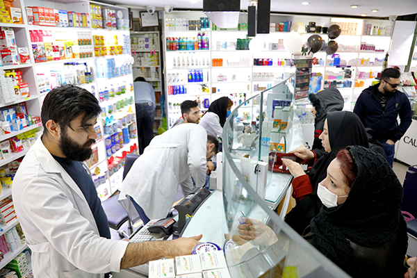 Devastating U.S. sanctions have contributed to Iran’s lack of medical supplies and the spread of Covid-19. One Iranian physician wrote: “At the moment, we are dealing with a shortage of basic supplies, like masks, because there is an embargo on paper materials that we need to make more. …” Here pharmacists in Tehran, Iran talk with customers, February 25. (Photo: AP)