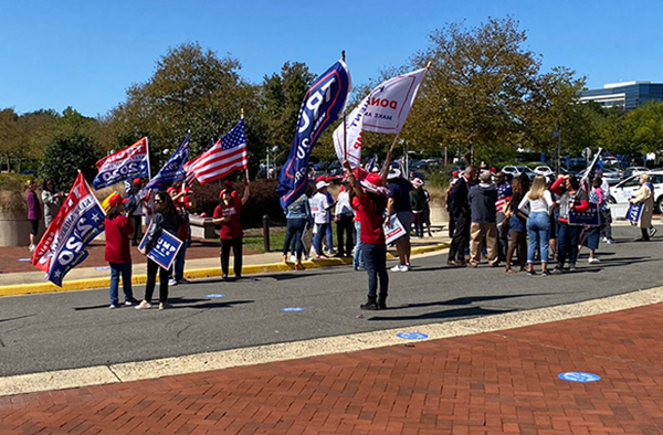 Fairfax, Virginia, September 19, 2020. MAGA crowd gathered where early voters had to pass to vote, shouting “Four more years” and waving their flags, and of course, not wearing masks or social distancing, putting waiting voters in jeopardy.