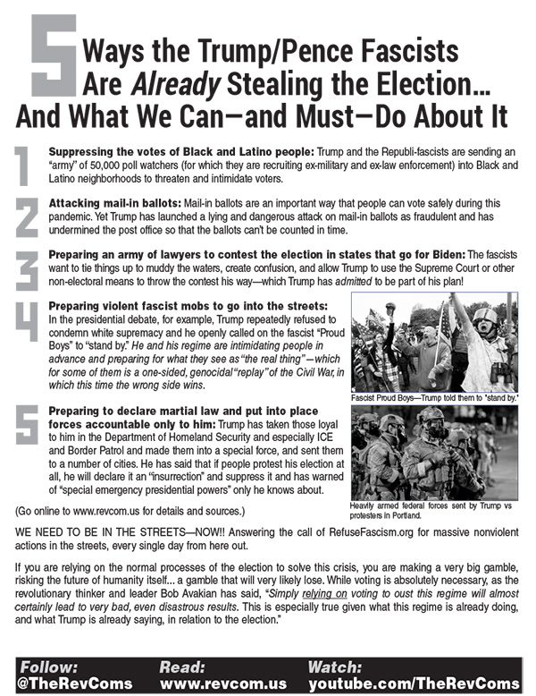 5. ALERT! Bill Barr is Paving the Way for Fascist Clampdown and Election Theft, revcom.us; “PEADS—Secret Framework for Total Authority” (in Fascist Juggernaut Moves Forward Rapidly and Aggressively), revcom.us; Trump/Pence Regime: Retooling the Governing Apparatus to Enthusiastically Serve Full-out Fascist Rule, revcom.us. [back]
