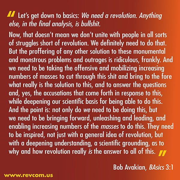 The relation between the struggle against this fascist regime and building the revolution is not a “straight road” or a “one-way street”: It must not be approached, by those who understand the need for revolution, as if “first we must build a mass movement to drive out this regime, and then we can turn our attention to working directly for revolution.” No. It is crucial to unite and mobilize people, from different perspectives, very broadly, around the demand that this regime must go, but it will be much more difficult to do this on the scale and with the determination that is required to meet this objective if there are not, at the same time, greater and greater numbers of people who have been brought forward around the understanding that it is necessary to put an end not only to this regime but to the system out of whose deep and defining contradictions this regime has arisen, a system which by its very nature has imposed, and will continue to impose, horrific and completely unnecessary suffering on the masses of humanity, until this system itself is abolished. And the more that people are brought forward to be consciously, actively working for revolution, the growing strength and “moral authority” of this revolutionary force will in turn strengthen the resolve of growing numbers of people to drive out this fascist regime now in power, even as many will not be (and some will perhaps never be) won to revolution.