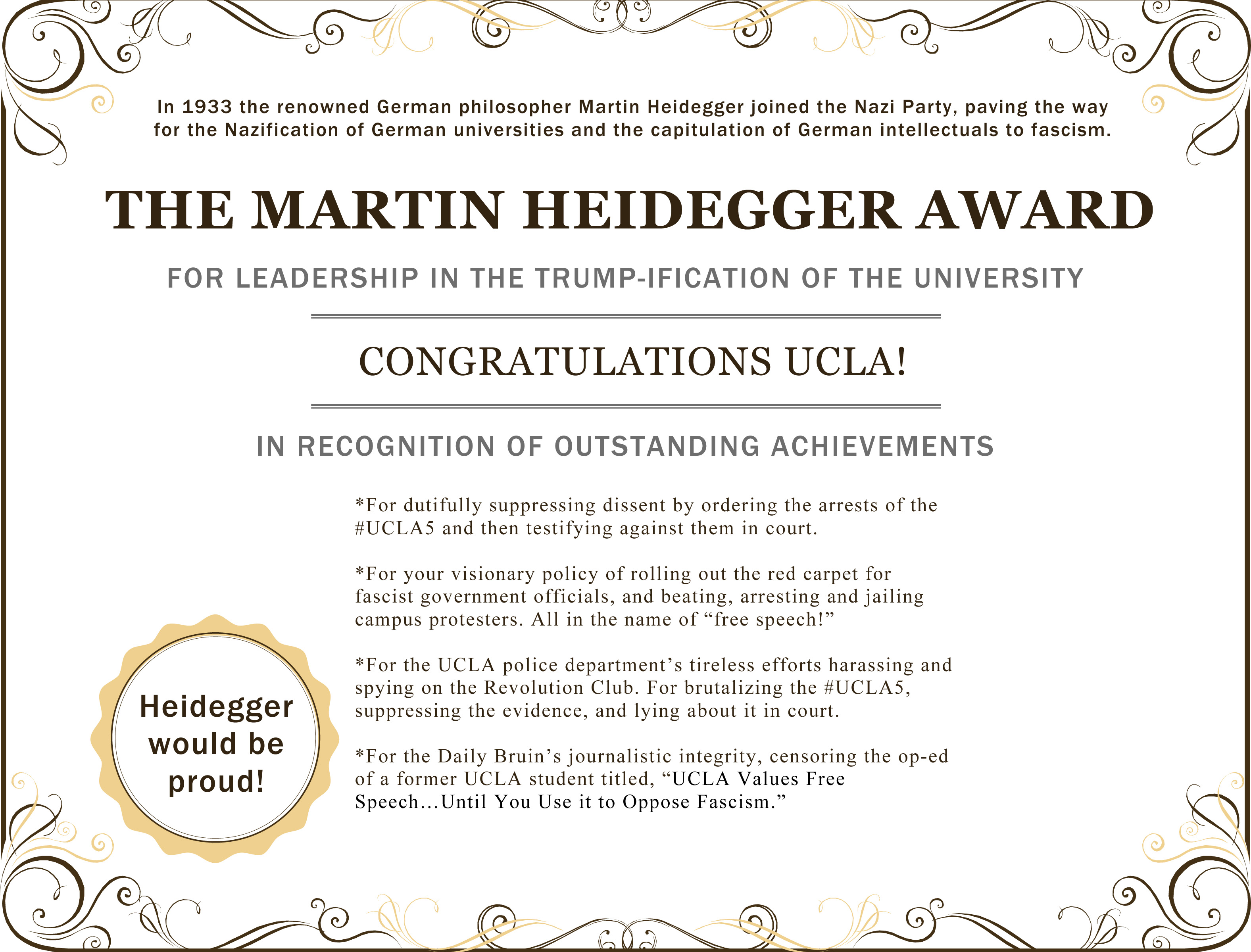 3 of the #UCLA5 presenting the Heidegger Award to UCLA incl administrators @mdeluca3 & @UCLA Police Department for leadership & outstanding acheivements in the Trump-ification of the University.